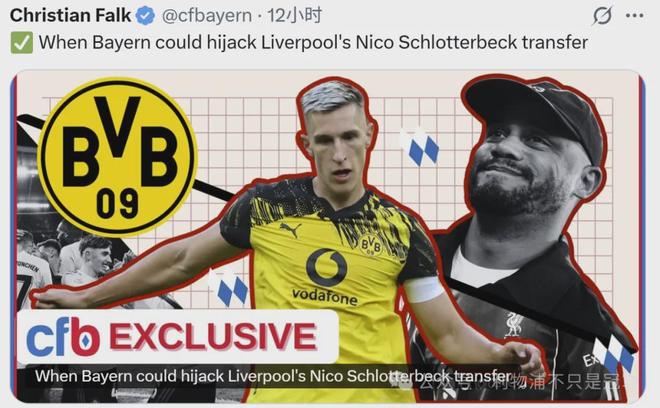 最近这一波传闻始于10月12日,利物浦网红博主“DaveOCKOP”发布号称独家消息:“利物浦已经与多特中卫施洛特贝克展开初步接触,且对话是积极的。”这个消息源看看就好,不必当真。