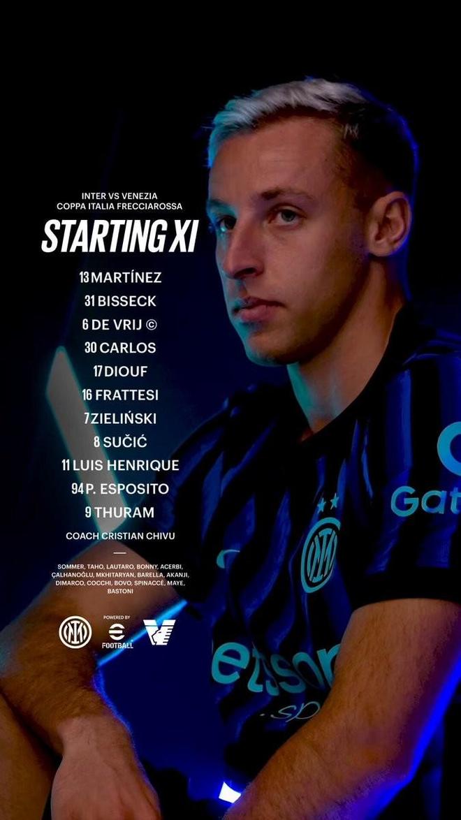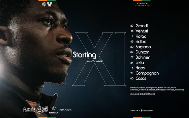 北京时间12月4日4:00,意大利杯1/8决赛,国际米兰坐镇梅阿查球场迎战威尼斯,本场主裁判为戴维德-迪马尔科,赛前双方首发出炉。
