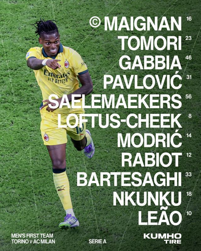 AC米兰首发:16-迈尼昂、23-托莫里、46-加比亚、31-帕夫洛维奇、56-萨勒马克尔斯、8-洛夫图斯-奇克、14-莫德里奇、12-拉比奥、33-巴尔泰萨吉、18-恩昆库、10-莱奥