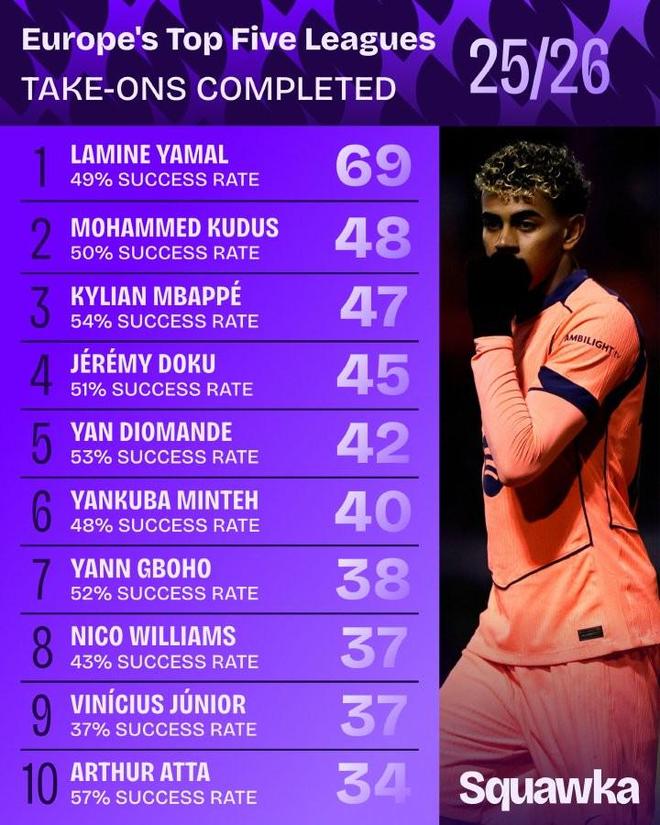 根据统计,本赛季到目前为止,亚马尔是欧洲五大联赛当中成功过人次数最多的球员,库杜斯位居第二,姆巴佩位居第三。