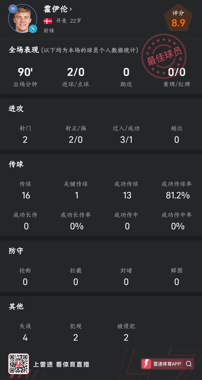 雷速体育10月02日讯 25-26赛季欧冠联赛阶段第二轮,意甲冠军那不勒斯坐镇主场2-1战胜葡超冠军葡萄牙体育,从而夺取本赛季欧冠首场胜利。那不勒斯能斩获胜利,丹麦前锋霍伊伦发挥了决定性作用,包办球队全部2粒入球。